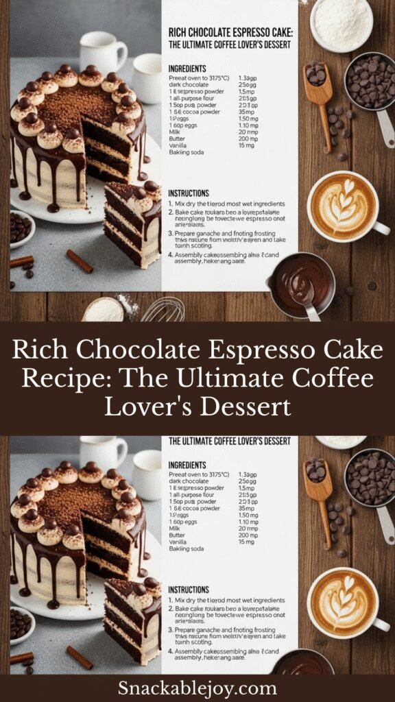 This Chocolate Espresso Cake is ideal for coffee enthusiasts, chocolate lovers, and anyone who appreciates a dessert that’s elegant yet comforting. It’s perfect for special occasions, holiday gatherings, or simply when you want to treat yourself to something extraordinary. Despite its impressive appearance and restaurant-quality taste, this cake is surprisingly straightforward to make at home with ingredients you probably already have in your pantry. Let me show you how to create this showstopper!